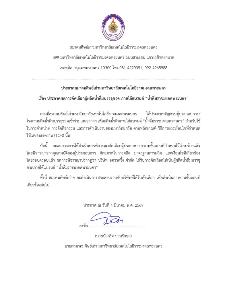 ประกาศ สมาคมศิษย์เก่ามหาวิทยาลัยเทคโนโลยีราชมงคลพระนครเรื่อง ประกาศผลการคัดเลือกผู้ผลิตน้ำดื่มบรรจุขวด ภายใต้แบรนด์ “น้ำดื่มราชมงคลพระนคร”